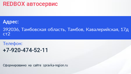 REDBOX, автосервис по адресу 392036, Тамбовская область, Тамбов, Кавалерийская, 17д ст2 в дальнейшем Организация, размещена в следующих категориях: