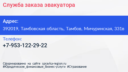 Служба заказа эвакуатора по адресу 392019, Тамбовская область, Тамбов, Мичуринская, 331в в дальнейшем Организация, размещена в следующих категориях: