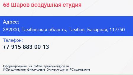 68 Шаров, воздушная студия по адресу 392000, Тамбовская область, Тамбов, Базарная, 117/50 в дальнейшем Организация, размещена в следующих категориях:
