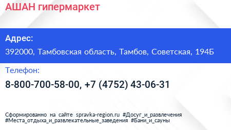 АШАН, гипермаркет по адресу 392000, Тамбовская область, Тамбов, Советская, 194Б в дальнейшем Организация, размещена в следующих категориях: