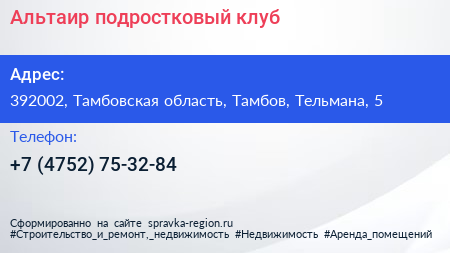 Альтаир, подростковый клуб по адресу 392002, Тамбовская область, Тамбов, Тельмана, 5 в дальнейшем Организация, размещена в следующих категориях: