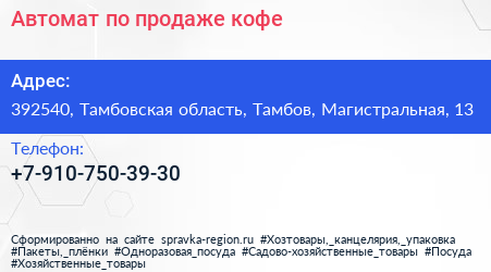 Автомат по продаже кофе по адресу 392540, Тамбовская область, Тамбов, Магистральная, 13 в дальнейшем Организация, размещена в следующих категориях: