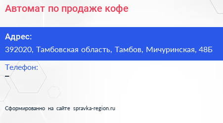 Автомат по продаже кофе по адресу 392020, Тамбовская область, Тамбов, Мичуринская, 48Б в дальнейшем Организация, размещена в следующих категориях: