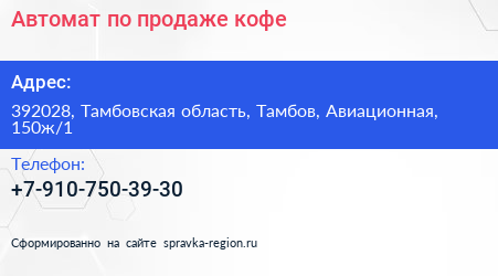 Автомат по продаже кофе по адресу 392028, Тамбовская область, Тамбов, Авиационная, 150ж/1 в дальнейшем Организация, размещена в следующих категориях: