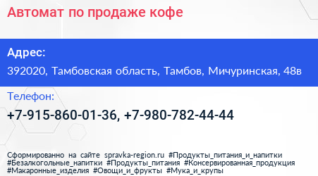 Автомат по продаже кофе по адресу 392020, Тамбовская область, Тамбов, Мичуринская, 48в в дальнейшем Организация, размещена в следующих категориях: