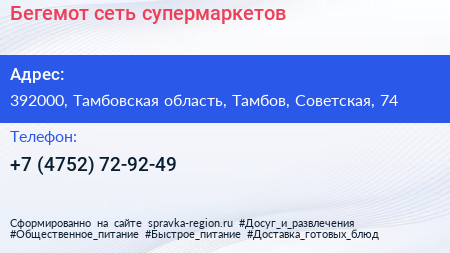 Бегемот, сеть супермаркетов по адресу 392000, Тамбовская область, Тамбов, Советская, 74 в дальнейшем Организация, размещена в следующих категориях: