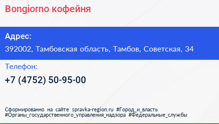 Bongiorno, кофейня по адресу 392002, Тамбовская область, Тамбов, Советская, 34 в дальнейшем Организация, размещена в следующих категориях: