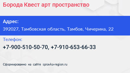 Борода Квест, арт-пространство по адресу 392027, Тамбовская область, Тамбов, Чичерина, 22 в дальнейшем Организация, размещена в следующих категориях: