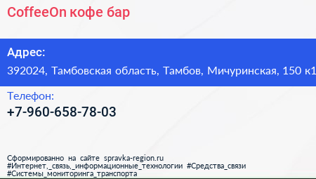 CoffeeOn, кофе-бар по адресу 392024, Тамбовская область, Тамбов, Мичуринская, 150 к1 в дальнейшем Организация, размещена в следующих категориях: