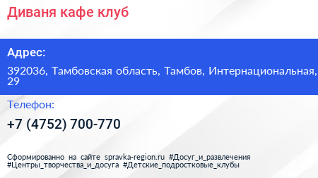 Диваня, кафе-клуб по адресу 392036, Тамбовская область, Тамбов, Интернациональная, 29 в дальнейшем Организация, размещена в следующих категориях: