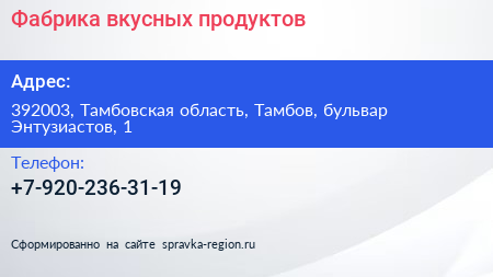 Фабрика вкусных продуктов по адресу 392003, Тамбовская область, Тамбов, бульвар Энтузиастов, 1 в дальнейшем Организация, размещена в следующих категориях: