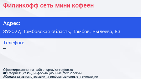 Филинкофф, сеть мини-кофеен по адресу 392027, Тамбовская область, Тамбов, Рылеева, 83 в дальнейшем Организация, размещена в следующих категориях: