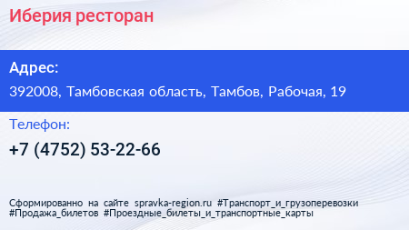 Иберия, ресторан по адресу 392008, Тамбовская область, Тамбов, Рабочая, 19 в дальнейшем Организация, размещена в следующих категориях: