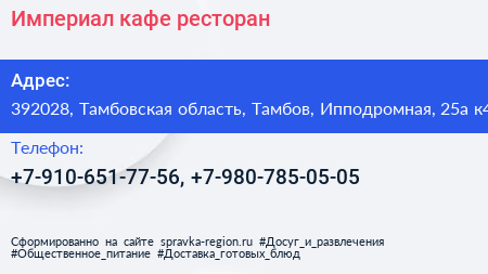 Империал, кафе-ресторан по адресу 392028, Тамбовская область, Тамбов, Ипподромная, 25а к4 в дальнейшем Организация, размещена в следующих категориях: