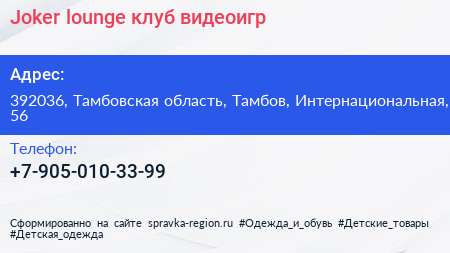 Joker lounge, клуб видеоигр по адресу 392036, Тамбовская область, Тамбов, Интернациональная, 56 в дальнейшем Организация, размещена в следующих категориях: