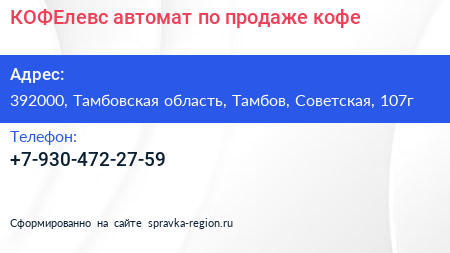 КОФЕлевс, автомат по продаже кофе по адресу 392000, Тамбовская область, Тамбов, Советская, 107г в дальнейшем Организация, размещена в следующих категориях: