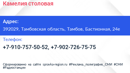 Камелия, столовая по адресу 392029, Тамбовская область, Тамбов, Бастионная, 24е в дальнейшем Организация, размещена в следующих категориях: