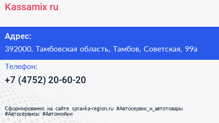 Kassamix.ru по адресу 392000, Тамбовская область, Тамбов, Советская, 99а в дальнейшем Организация, размещена в следующих категориях:
