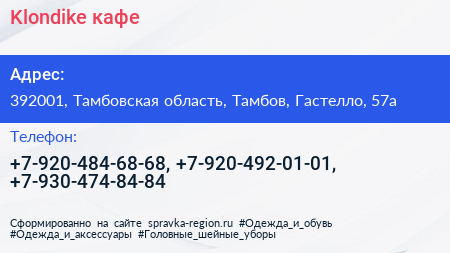 Klondike, кафе по адресу 392001, Тамбовская область, Тамбов, Гастелло, 57а в дальнейшем Организация, размещена в следующих категориях: