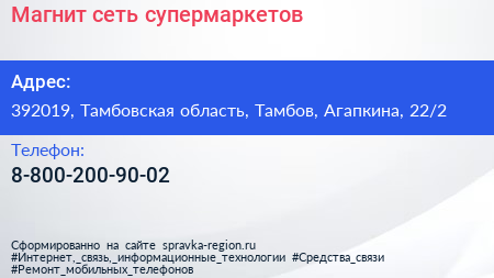 Магнит, сеть супермаркетов по адресу 392019, Тамбовская область, Тамбов, Агапкина, 22/2 в дальнейшем Организация, размещена в следующих категориях: