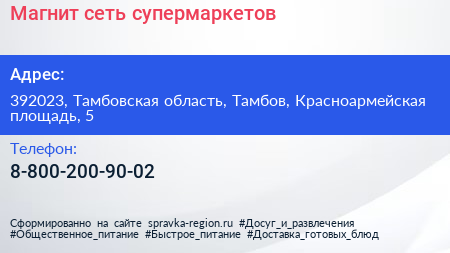 Магнит, сеть супермаркетов по адресу 392023, Тамбовская область, Тамбов, Красноармейская площадь, 5 в дальнейшем Организация, размещена в следующих категориях: