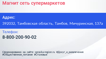 Магнит, сеть супермаркетов по адресу 392032, Тамбовская область, Тамбов, Мичуринская, 137а в дальнейшем Организация, размещена в следующих категориях: