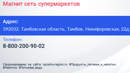 Магнит, сеть супермаркетов по адресу 392032, Тамбовская область, Тамбов, Никифоровская, 22д в дальнейшем Организация, размещена в следующих категориях: