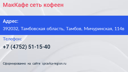 МакКафе, сеть кофеен по адресу 392032, Тамбовская область, Тамбов, Мичуринская, 114в в дальнейшем Организация, размещена в следующих категориях: