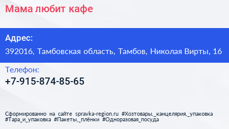 Мама любит, кафе по адресу 392016, Тамбовская область, Тамбов, Николая Вирты, 16 в дальнейшем Организация, размещена в следующих категориях: