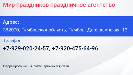 Мир праздников, праздничное агентство по адресу 392000, Тамбовская область, Тамбов, Державинская, 13 в дальнейшем Организация, размещена в следующих категориях: