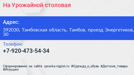 На Урожайной, столовая по адресу 392030, Тамбовская область, Тамбов, проезд Энергетиков, 30 в дальнейшем Организация, размещена в следующих категориях: