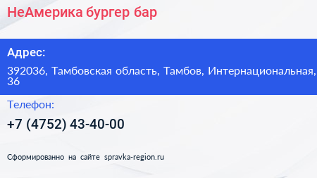 НеАмерика, бургер-бар по адресу 392036, Тамбовская область, Тамбов, Интернациональная, 36 в дальнейшем Организация, размещена в следующих категориях: