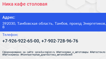 Ника, кафе-столовая по адресу 392030, Тамбовская область, Тамбов, проезд Энергетиков, 8 в дальнейшем Организация, размещена в следующих категориях:
