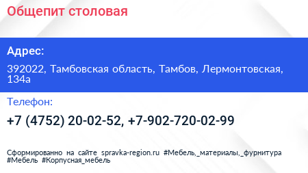 Общепит, столовая по адресу 392022, Тамбовская область, Тамбов, Лермонтовская, 134а в дальнейшем Организация, размещена в следующих категориях: