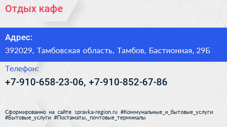 Отдых, кафе по адресу 392029, Тамбовская область, Тамбов, Бастионная, 29Б в дальнейшем Организация, размещена в следующих категориях: