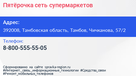 Пятёрочка, сеть супермаркетов по адресу 392008, Тамбовская область, Тамбов, Чичканова, 57/2 в дальнейшем Организация, размещена в следующих категориях: