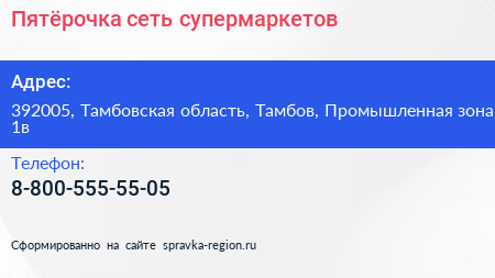 Пятёрочка, сеть супермаркетов по адресу 392005, Тамбовская область, Тамбов, Промышленная зона, 1в в дальнейшем Организация, размещена в следующих категориях: