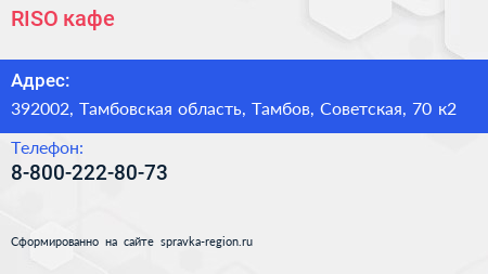 RISO, кафе по адресу 392002, Тамбовская область, Тамбов, Советская, 70 к2 в дальнейшем Организация, размещена в следующих категориях: