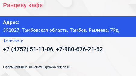 Рандеву, кафе по адресу 392027, Тамбовская область, Тамбов, Рылеева, 79д в дальнейшем Организация, размещена в следующих категориях: