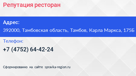Репутация, ресторан по адресу 392000, Тамбовская область, Тамбов, Карла Маркса, 175Б в дальнейшем Организация, размещена в следующих категориях: