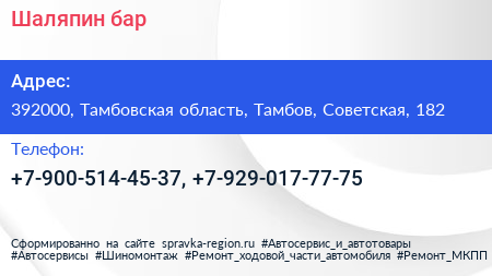 Шaляпин, бар по адресу 392000, Тамбовская область, Тамбов, Советская, 182 в дальнейшем Организация, размещена в следующих категориях: