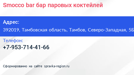 Smocco bar, бар паровых коктейлей по адресу 392019, Тамбовская область, Тамбов, Северо-Западная, 5Б в дальнейшем Организация, размещена в следующих категориях:
