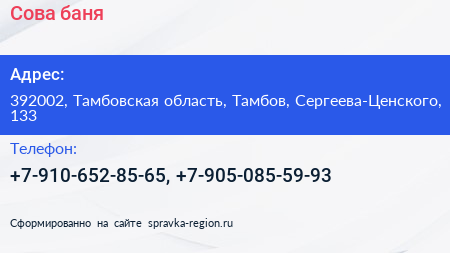 Сова, баня по адресу 392002, Тамбовская область, Тамбов, Сергеева-Ценского, 133 в дальнейшем Организация, размещена в следующих категориях: