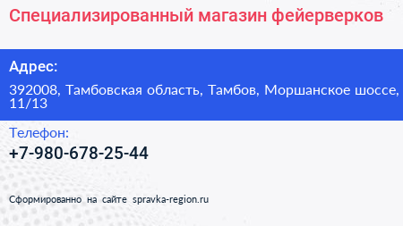 Специализированный магазин фейерверков по адресу 392008, Тамбовская область, Тамбов, Моршанское шоссе, 11/13 в дальнейшем Организация, размещена в следующих категориях: