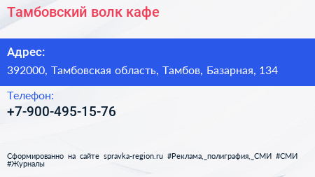 Тамбовский волк, кафе по адресу 392000, Тамбовская область, Тамбов, Базарная, 134 в дальнейшем Организация, размещена в следующих категориях: