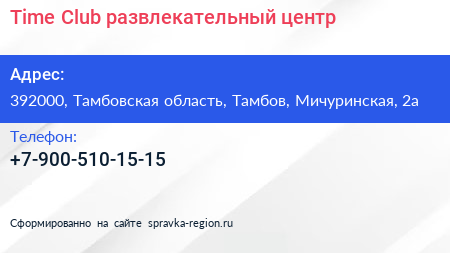 Time Club, развлекательный центр по адресу 392000, Тамбовская область, Тамбов, Мичуринская, 2а в дальнейшем Организация, размещена в следующих категориях: