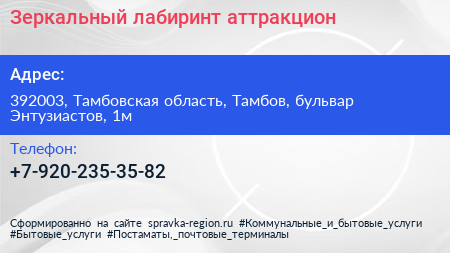 Зеркальный лабиринт, аттракцион по адресу 392003, Тамбовская область, Тамбов, бульвар Энтузиастов, 1м в дальнейшем Организация, размещена в следующих категориях: