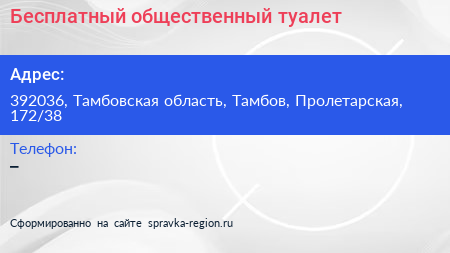 Бесплатный общественный туалет по адресу 392036, Тамбовская область, Тамбов, Пролетарская, 172/38 в дальнейшем Организация, размещена в следующих категориях: