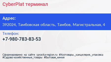 CyberPlat, терминал по адресу 392024, Тамбовская область, Тамбов, Магистральная, 4 в дальнейшем Организация, размещена в следующих категориях: