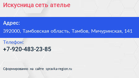 Искусница, сеть ателье по адресу 392000, Тамбовская область, Тамбов, Мичуринская, 141 в дальнейшем Организация, размещена в следующих категориях: